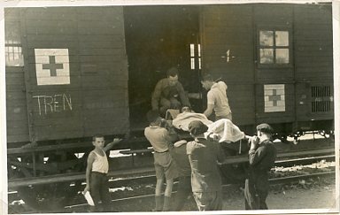 Hospital train at Aragon Front, 1936. (32/2/18A). Man on stretcher being loaded onto train.