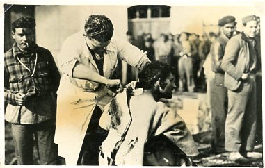 Medical care by the wayside, Jan-Feb 1939. (33A/14/11A). Still retreating before the Italian Army. People in flight.