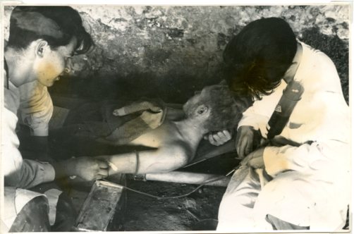 Blood Transfusion in the Cave Hospital, 1938. (33/8/13). Ebro, Leah Manning (left), Ada Hodson (right). Patient - Harry Dobson.