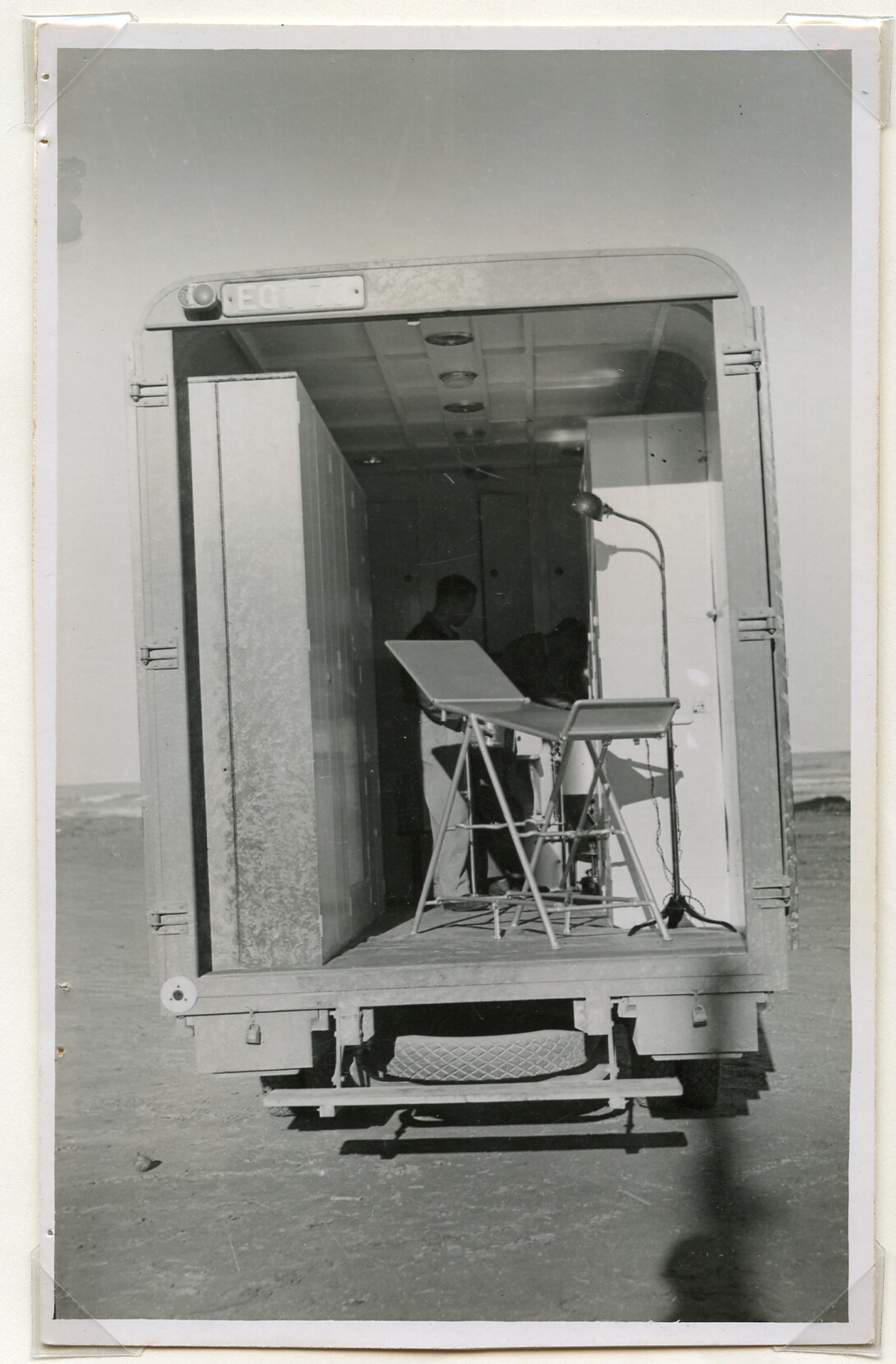 X-ray van, 1938. (33/9/21B). X-ray van, Mavis King sitting by van. British Auto-chirs at Sabinosa.