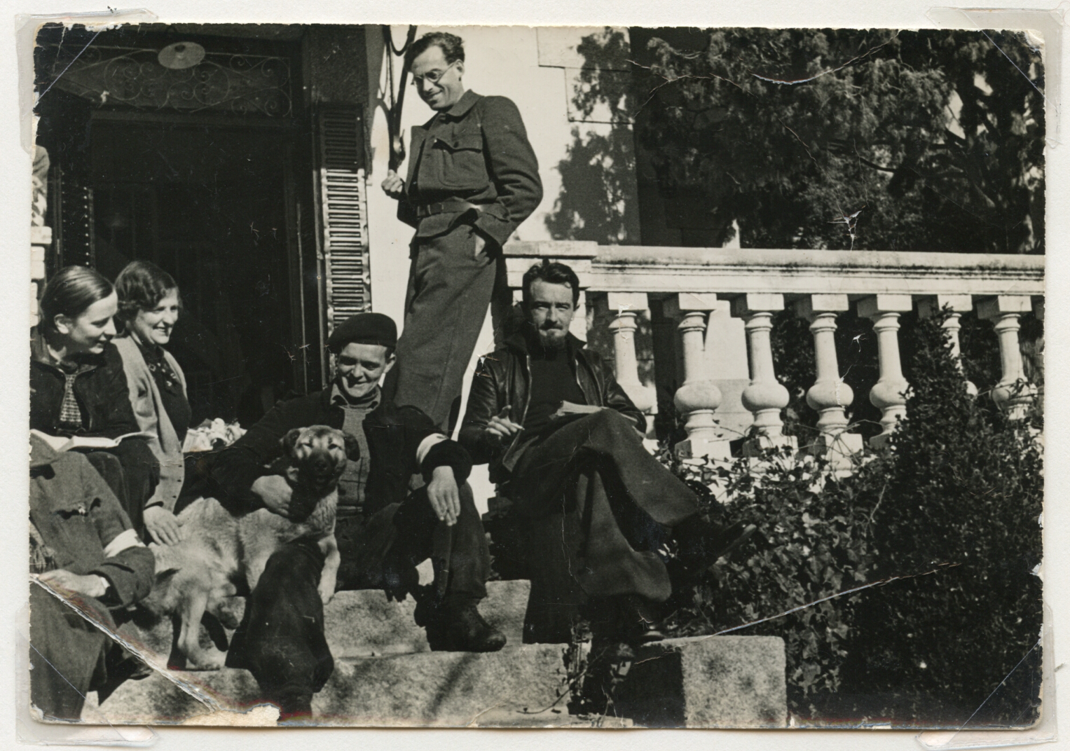 British Medical Unit, 1937. (A2/C/76). Right to Left - Archie Cochrane U.C.H (Scotch), Bülk (German Surgeon - Standing), Scottie (Dog), Mollie Murphy (Scotch Nurse), Joan Purser (English Nurse).
