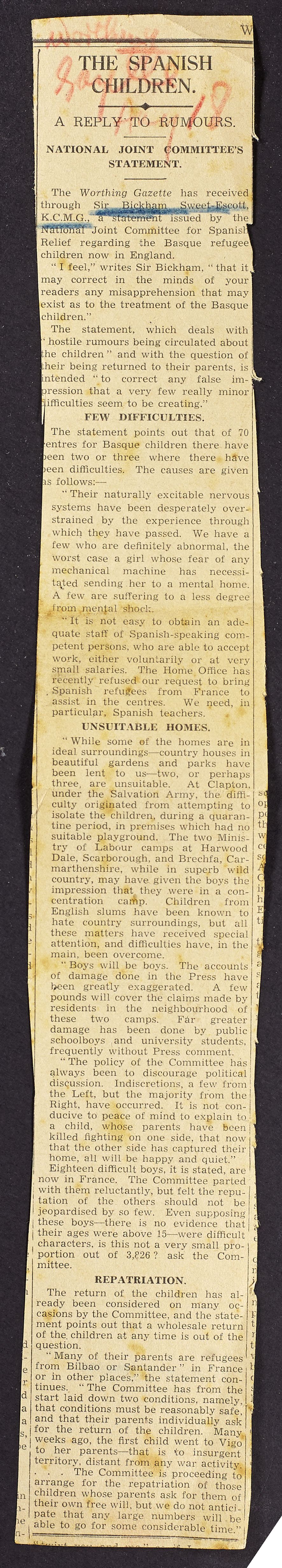In 1937 4,000 children fled the Spanish Civil War (1936-1939) and arrived on British shores. This was the largest single influx of child refugees in British history. Marking Refugee Week 2019, we have created an online exhibition showcasing items from our Spanish Collection documenting the children's journey, their experiences and the support they received from the British people, with a unique scrapbook on the 'colony' in Worthing as its centre piece.